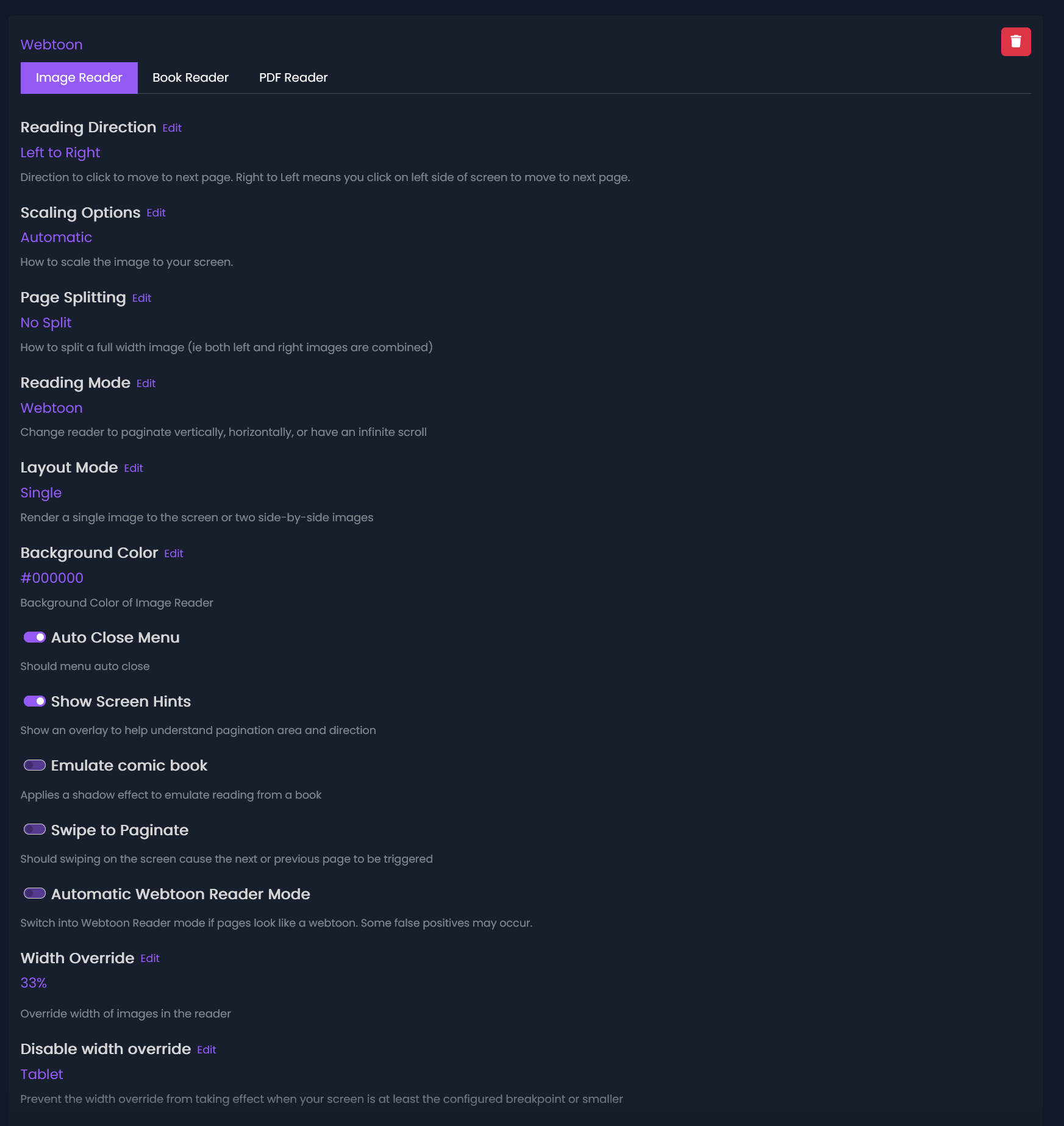 In the popup click on the name you set in the previous steps. This should make it always apply the settings to the comics you read within that library, while keeping your default preferences for the other libraries. Reading profiles can be set on a per book/chapter basis, per series basis, or per library basis if you want to set those for any of the other libraries now.